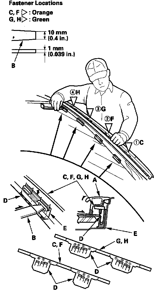 2. While pulling the clip portion of the molding up by hand, push each of the six or eight small hooks (D) in the numbered sequence shown to release the clip from the retainer (E). Do not try to pry up the clip even if it is hard to release from the retainer.