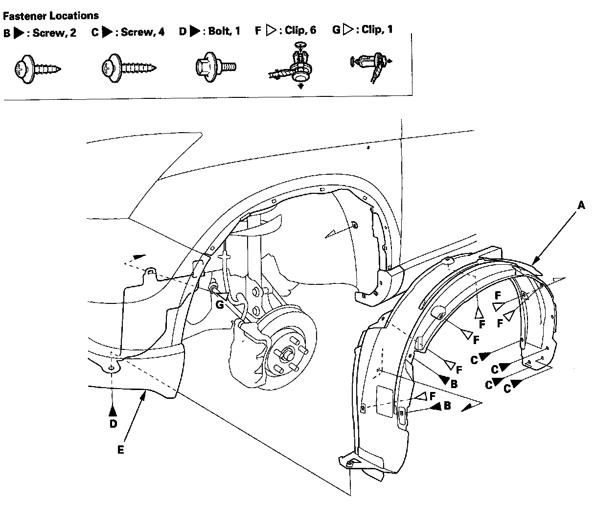 2. Remove the clips (F, G) securing the front inner fender (and splash shield) on the body.
