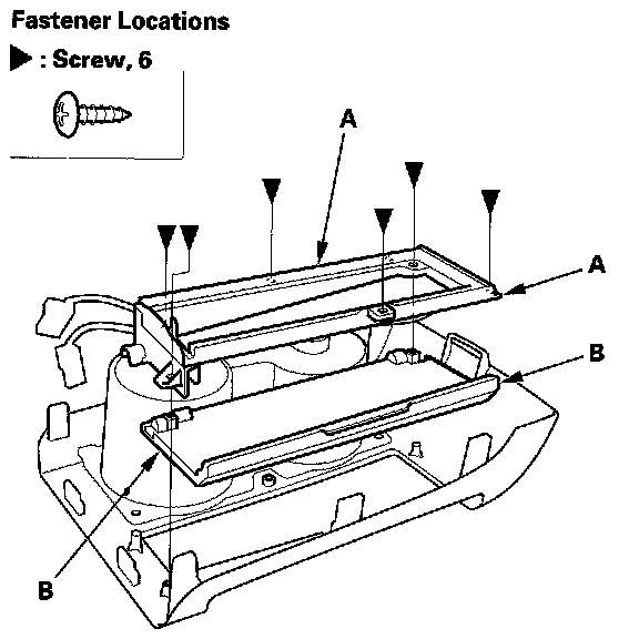 3. From the center console upper panel, remove the screws, then remove the CD box (A) and inner lid (B) or pocket.