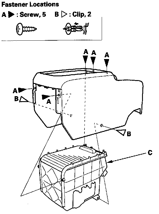 4. Remove the screws, then remove the cup holder (A). Detach the harness clips (B), and remove the console subharness (C) from the cup holder.