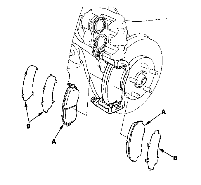 5. Remove the brake pads (A) and the pad shims (B).