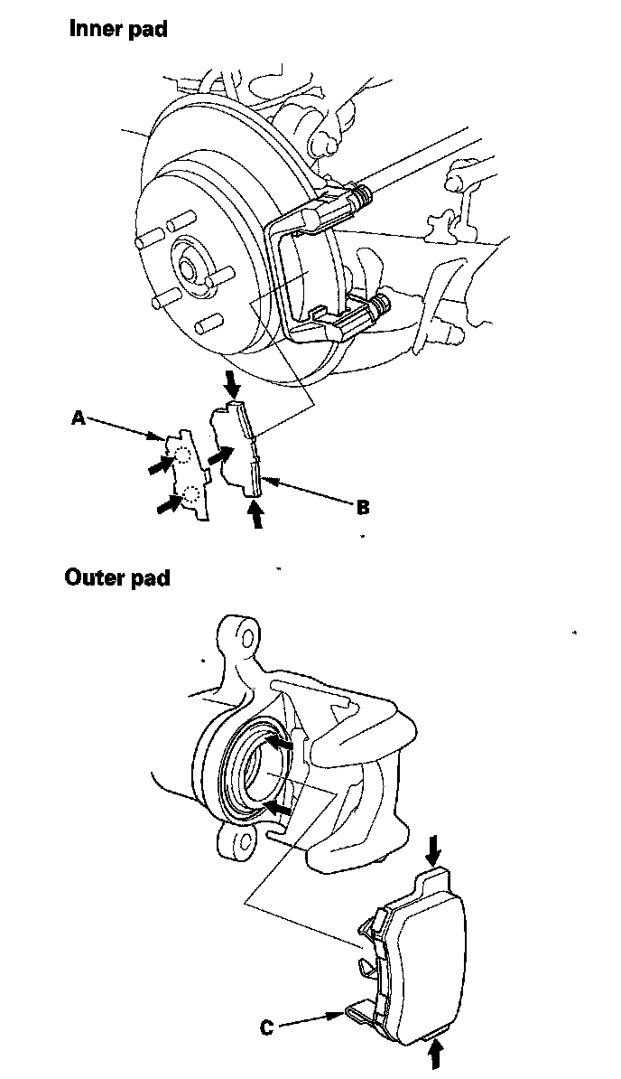 17. Install the brake pads and pad shims correctly. Install the brake pad with the wear indicator (C) on the bottom inside. If you are reusing the brake pads, always reinstall the brake pads in their original positions to prevent a momentary loss of braking efficiency.