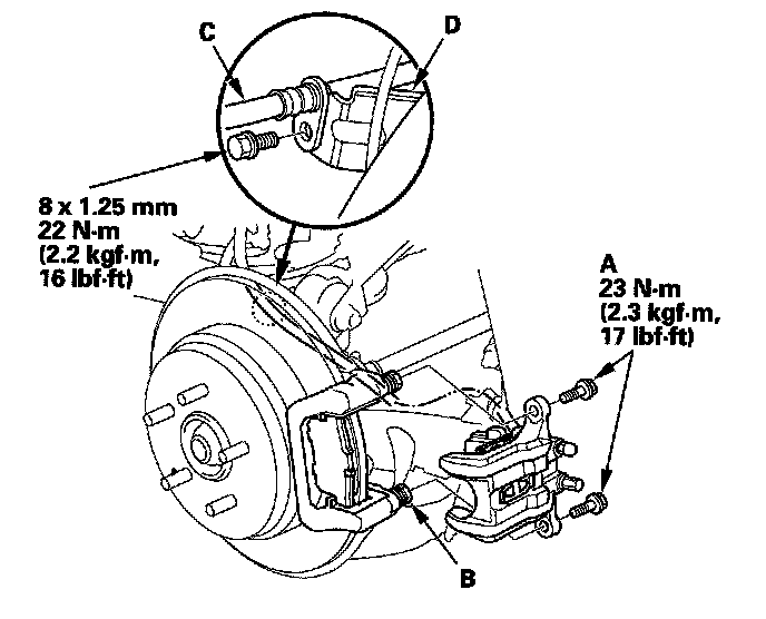 19. Install the brake hose (C) to the brake hose bracket (D).