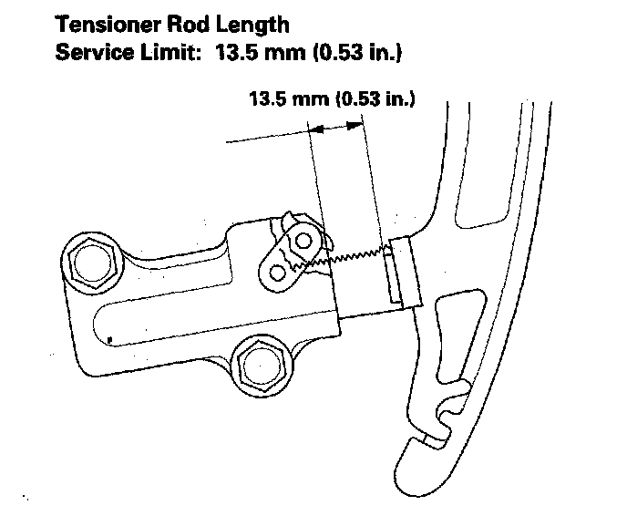 14. Measure the tensioner rod length between the tensioner body and bottom of the flat surface section on the tensioner rod. If the length is more than the service limit, replace the cam chain and the oil pump chain.
