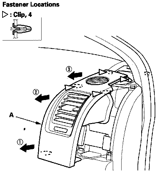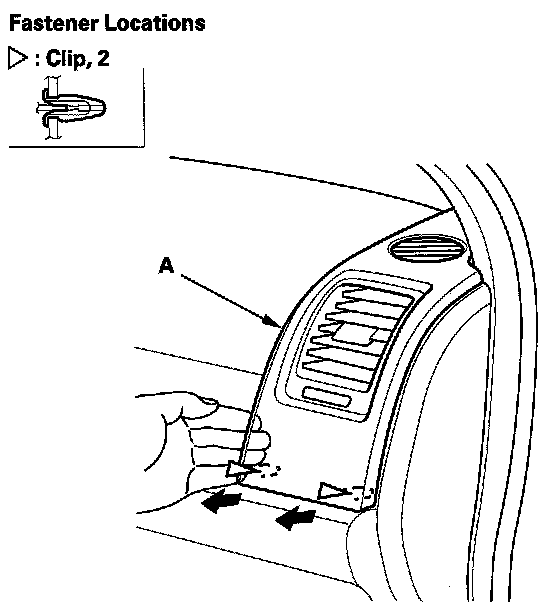 3. Pull the lower portion of the passenger's vent panel (A) partially out by hand. Detach the upper clips by pulling the middle and upper portions of the panel toward you.