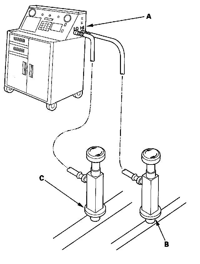 1. Connect an R-134a refrigerant recovery/recycling/charging station (A) to the high-pressure service port (B) and the low-pressure service port (C), as shown, following the equipment manufacturer's instructions.