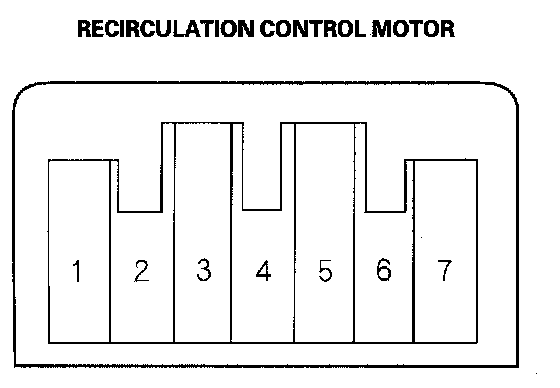 2. Connect battery power to the No.1 terminal of the recirculation control motor, and ground the No.5 and No.7 terminals; the recirculation control motor should run smoothly. To avoid damaging the recirculation control motor, do not reverse power and ground. Disconnect the No.5 or No.7 terminals from ground; the recirculation control motor should stop at Fresh (when the No.5 terminal is disconnected) or Recirculate (when the No.7 terminal is disconnected). Don't cycle the recirculation control motor for a long time.