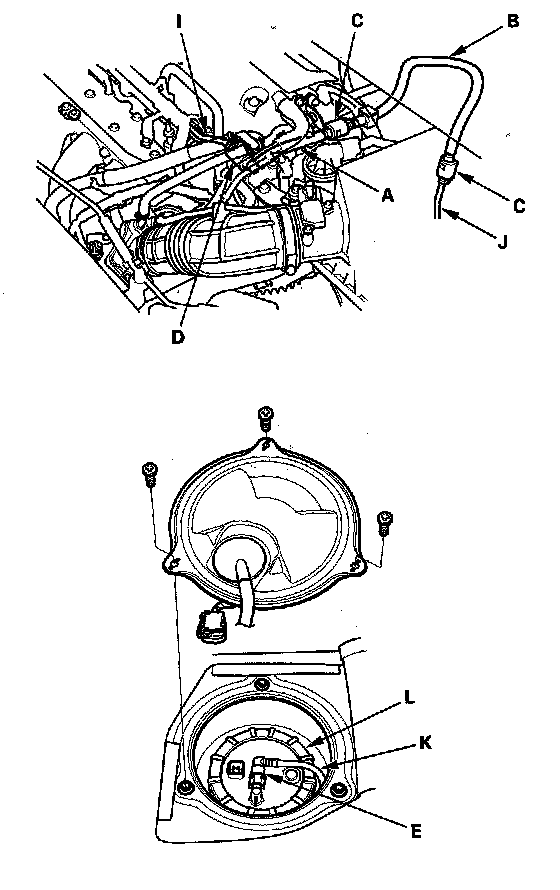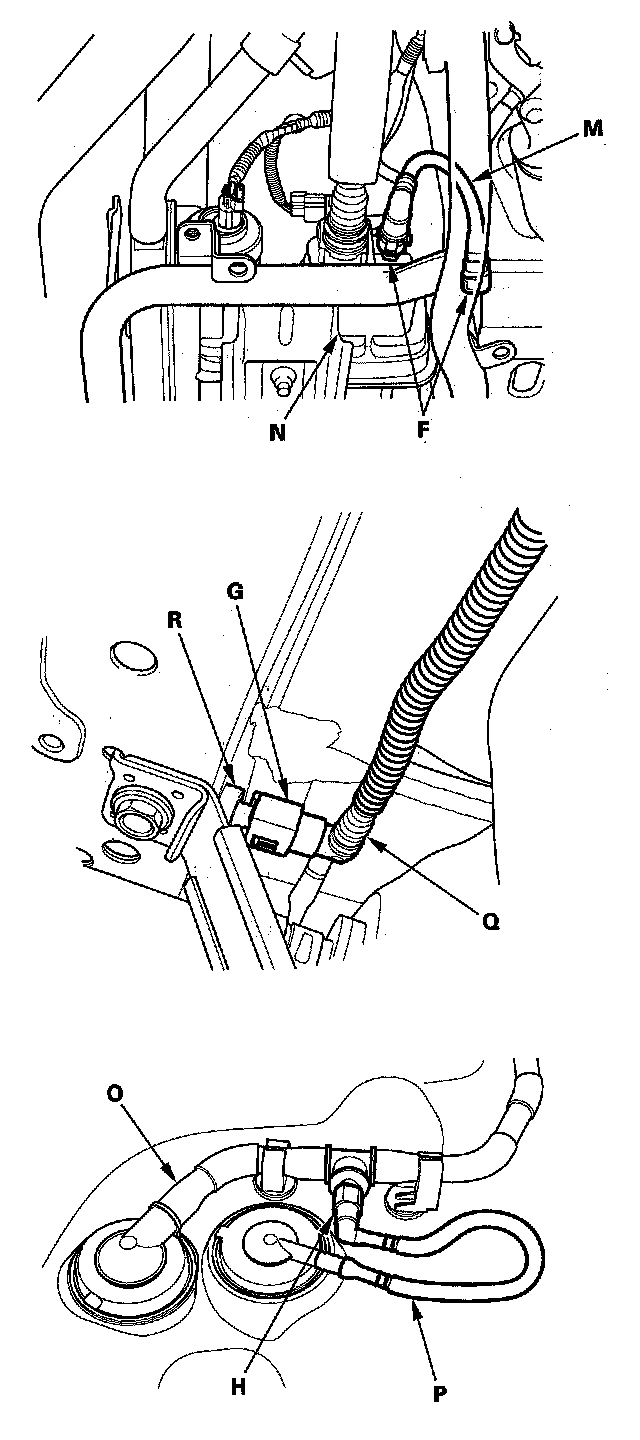 Fuel Line/Quick-Connect Fitting PrecautionsThe fuel line/quick-connect fittings (C), (D), (E), (F), (G), and (H) connect the fuel rail (I) to fuel feed hose A, fuel feed hose A to fuel feed hose B, fuel feed hose B to the fuel line (J), the fuel line (K) to the fuel tank unit (L), the fuel vapor line (M) to the EVAP canister (N), the fuel tank vapor control valve hose (O) to the fuel tank vapor/liquid separator valve hose (P), and the fuel tank vapor recirculation tube (Q) to the joint (R). When removing or installing the fuel feed hose, the fuel tank unit, or the fuel tank, it is necessary to disconnect or connect the quick-connect fittings.