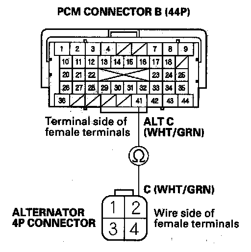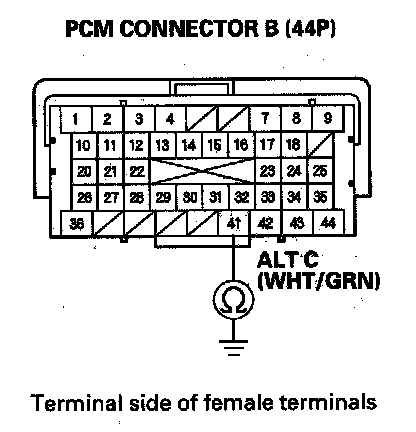 13. Check for continuity between PCM connector terminal B41 and alternator 4P connector terminal No. 2.
