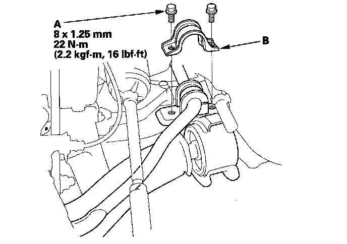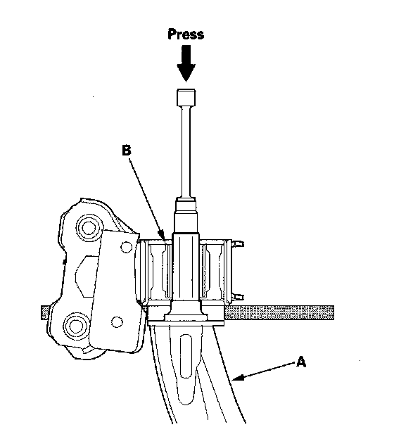1. Press out the lower arm (A) with the suitable socket wrench and a hydraulic press, and remove the lower arm from the bushing (B).