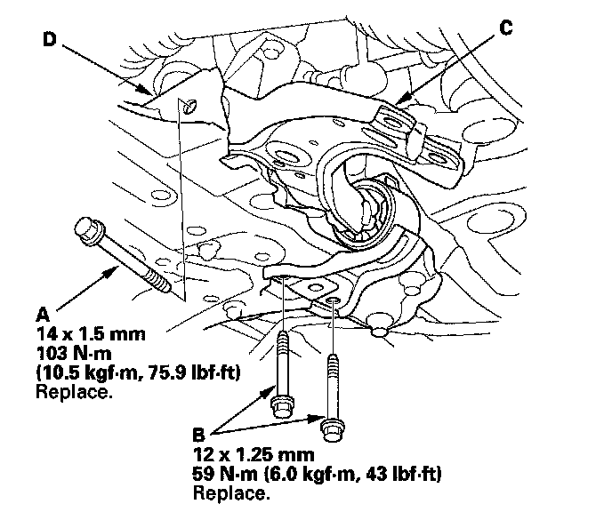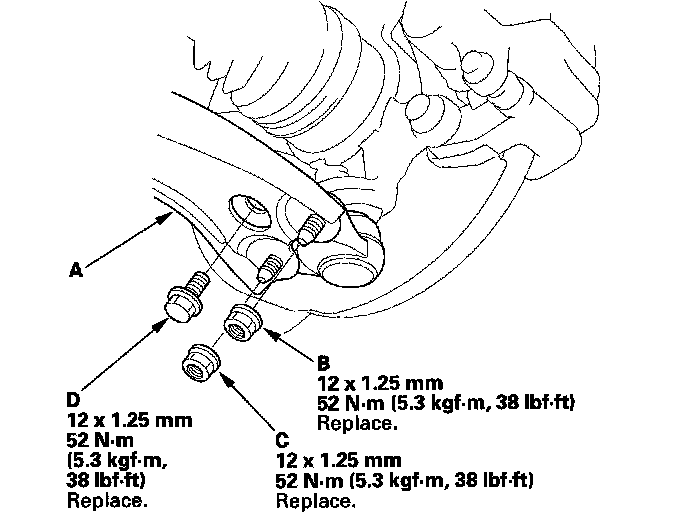 7. Remove the lower arm mounting bolts (B), then remove the lower arm (C) from the front suspension subframe (D).