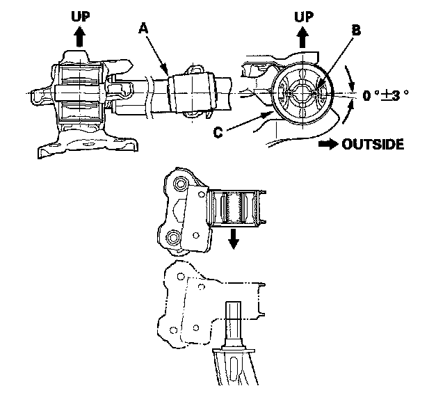 3. Align the angle of the lower arm (A) and the tab portion (B) of the bushing (C). Press in the bushing by hand first.
