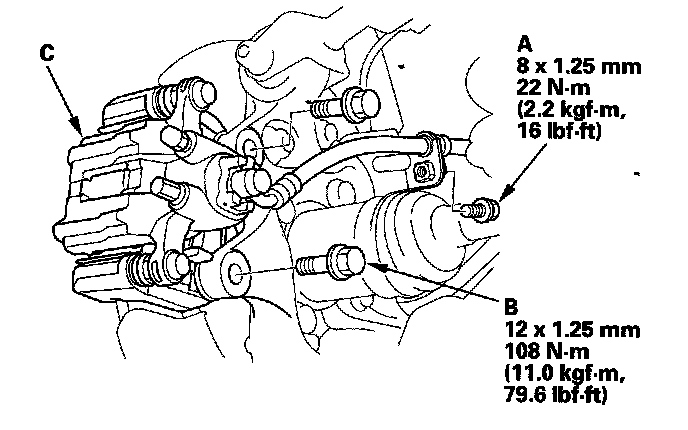 4. Remove the brake caliper bracket mounting bolts (B), and remove the caliper assembly (C) from the knuckle. To prevent damage to the caliper assembly or brake hose, use a short piece of wire to hang the caliper assembly from the undercarriage. Do not twist the brake hose excessively.