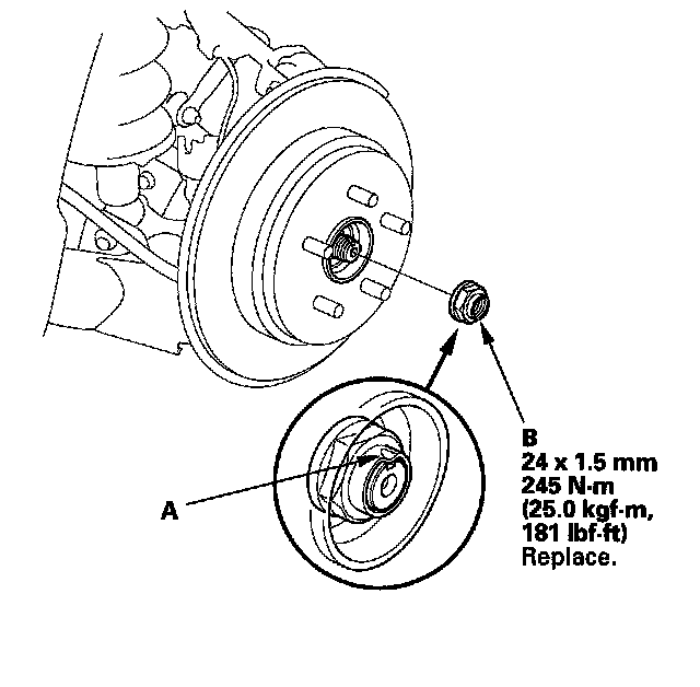^ Before installing the spindle nut, apply a small amount of engine oil to the seating surface of the nut. After tightening, use a drift to stake the spindle nut shoulder against the driveshaft.
