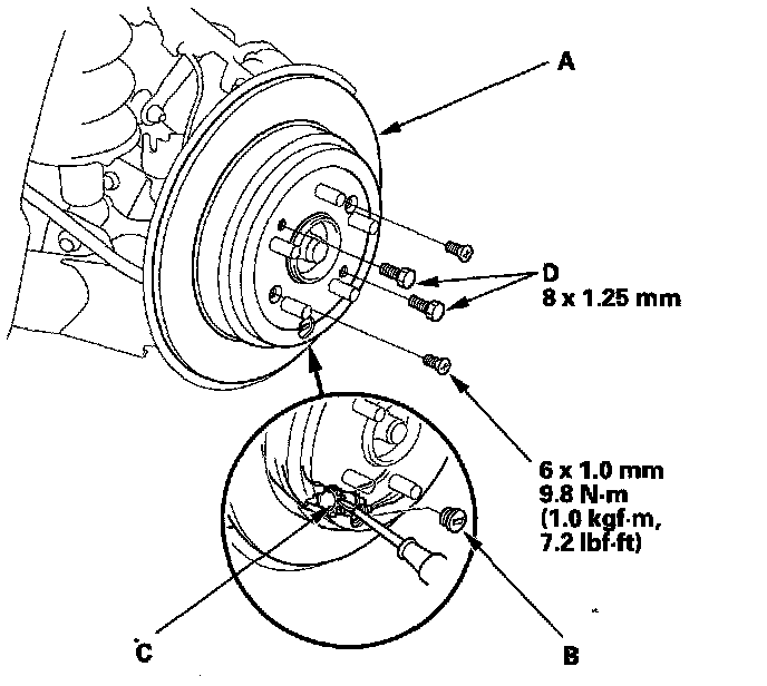^ If the brake drum is stuck to the hub bearing unit, screw two 8 x 1.25 mm bolts (D) into the brake drum to push it away from the hub bearing unit. Turn each bolt 90 degrees at a time to prevent cocking the brake drum.