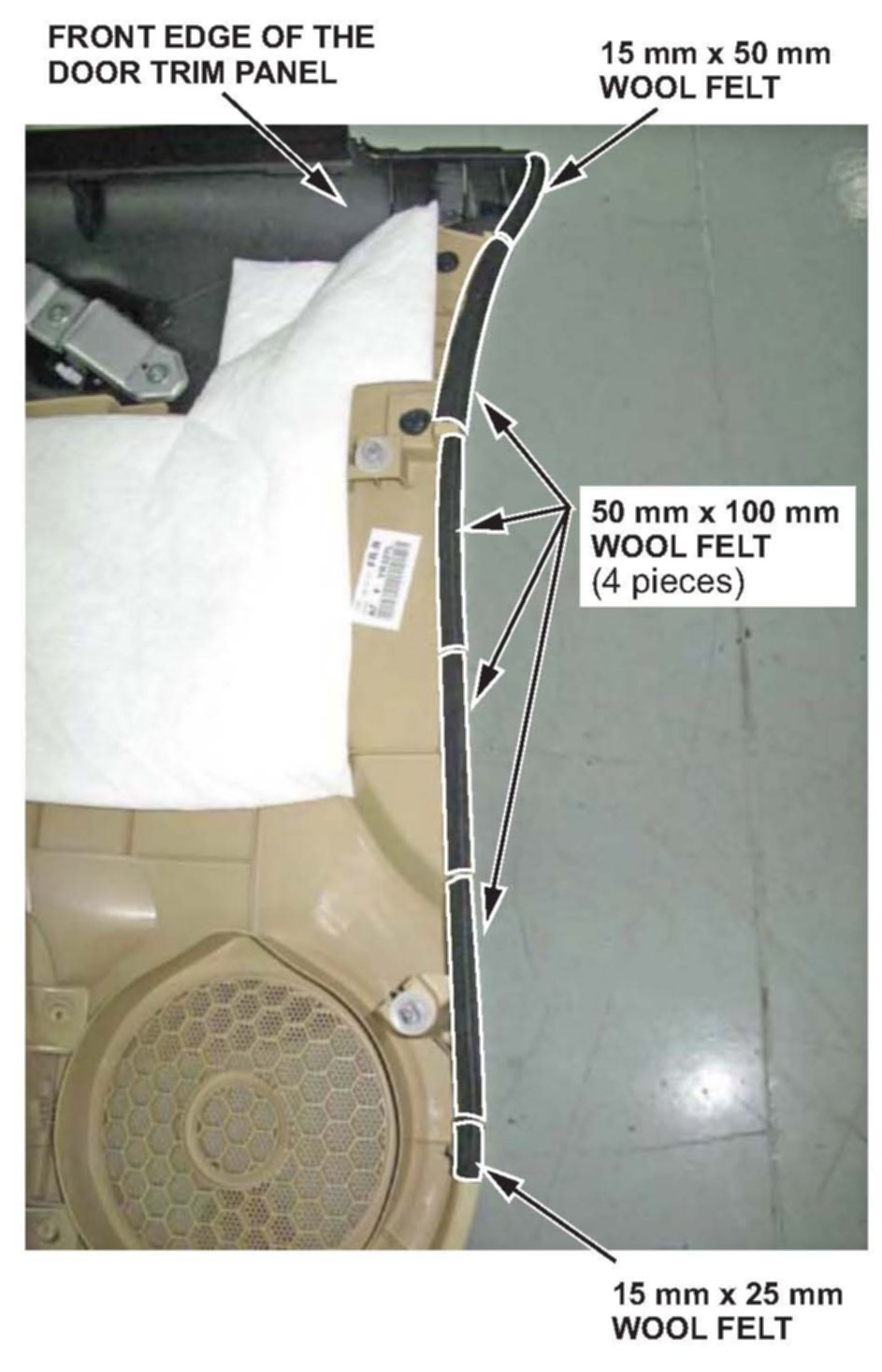 3. Attach all six pieces of wool felt to the front edge of the door panel as shown.