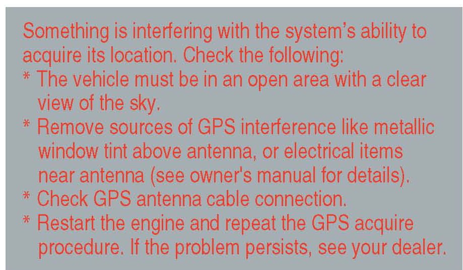 ^ The GPS antenna receives location information from orbiting satellites. Anything that blocks or interferes with the signal affects accuracy. The GPS signal can be blocked or interfered with (vehicle position shown incorrectly on the map) by: