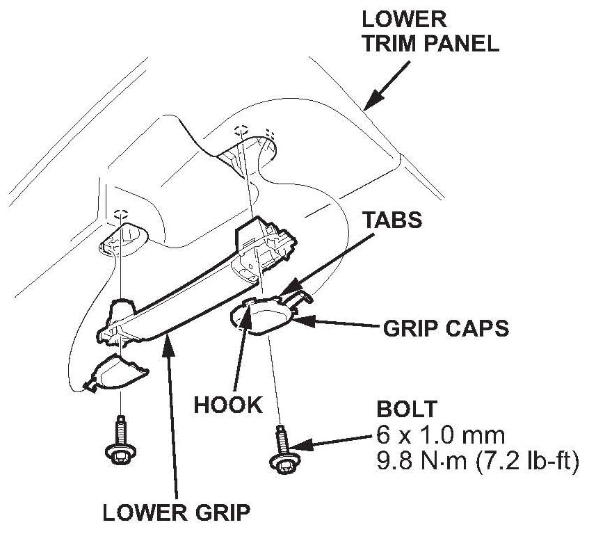 ^ Release the hooks and the tabs with the appropriate trim tool, then pull and remove the lower grip caps.