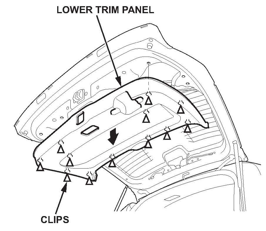 ^ Pull out the tailgate upper trim by hand to detach the clips, then remove the trim.
