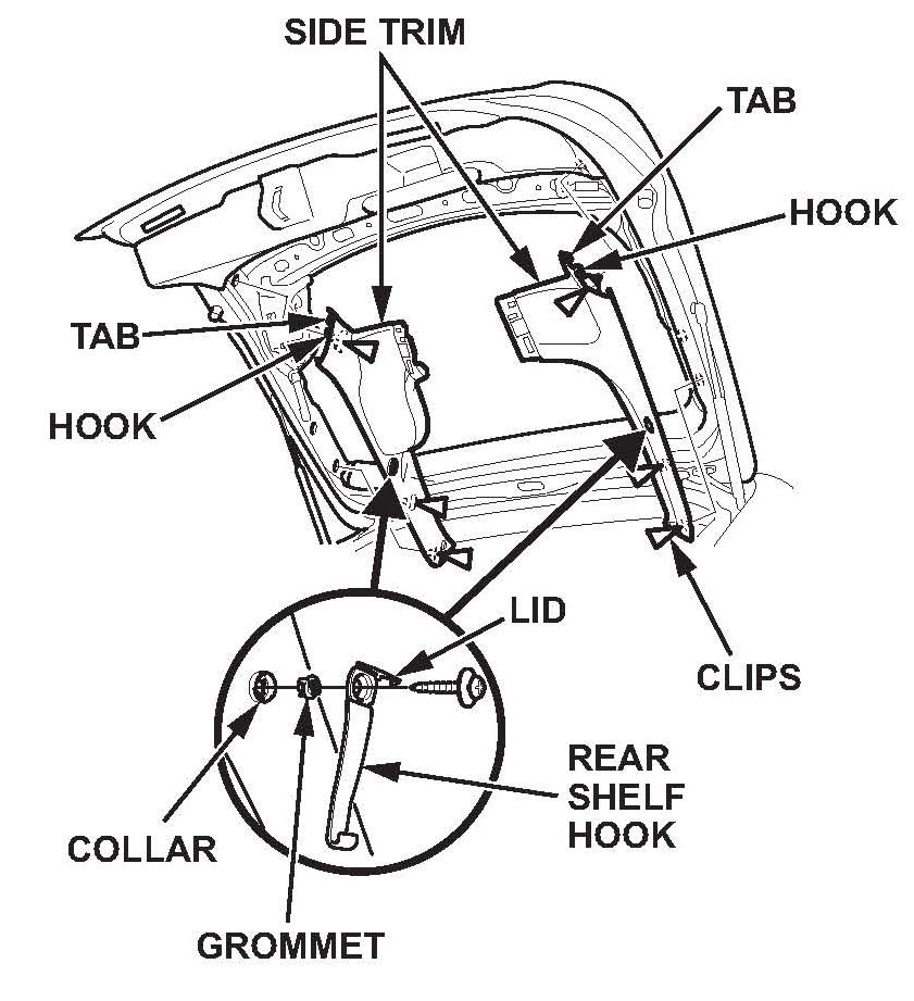 ^ If equipped: Pry out the hook's lid, and remove the screw, the grommet, the collar, and the rear shelf hook.