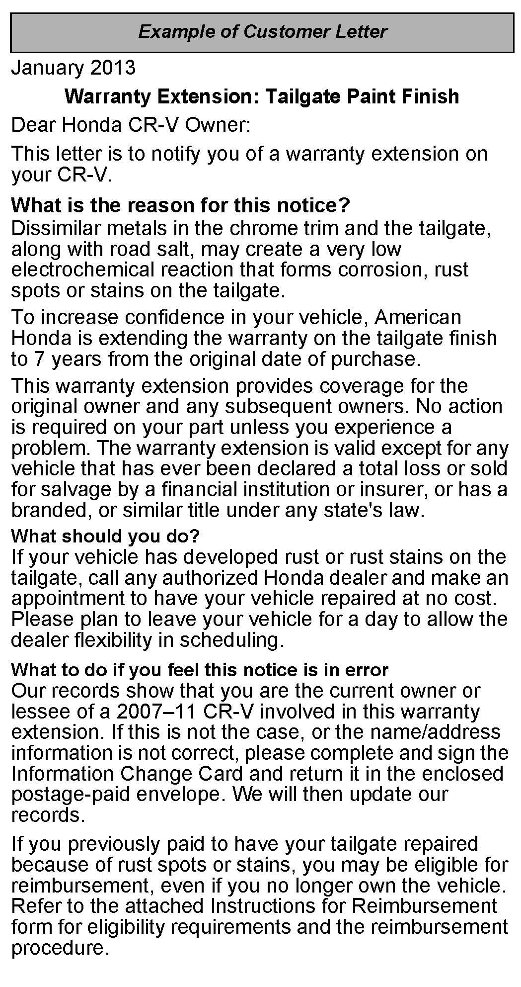 Owners of affected vehicles will receive a notification of this warranty extension starting in January 2013. An example of the customer notification is included at the end of this service bulletin.