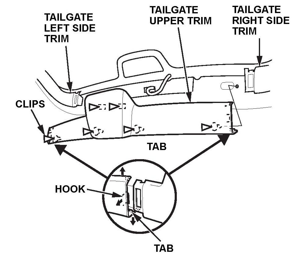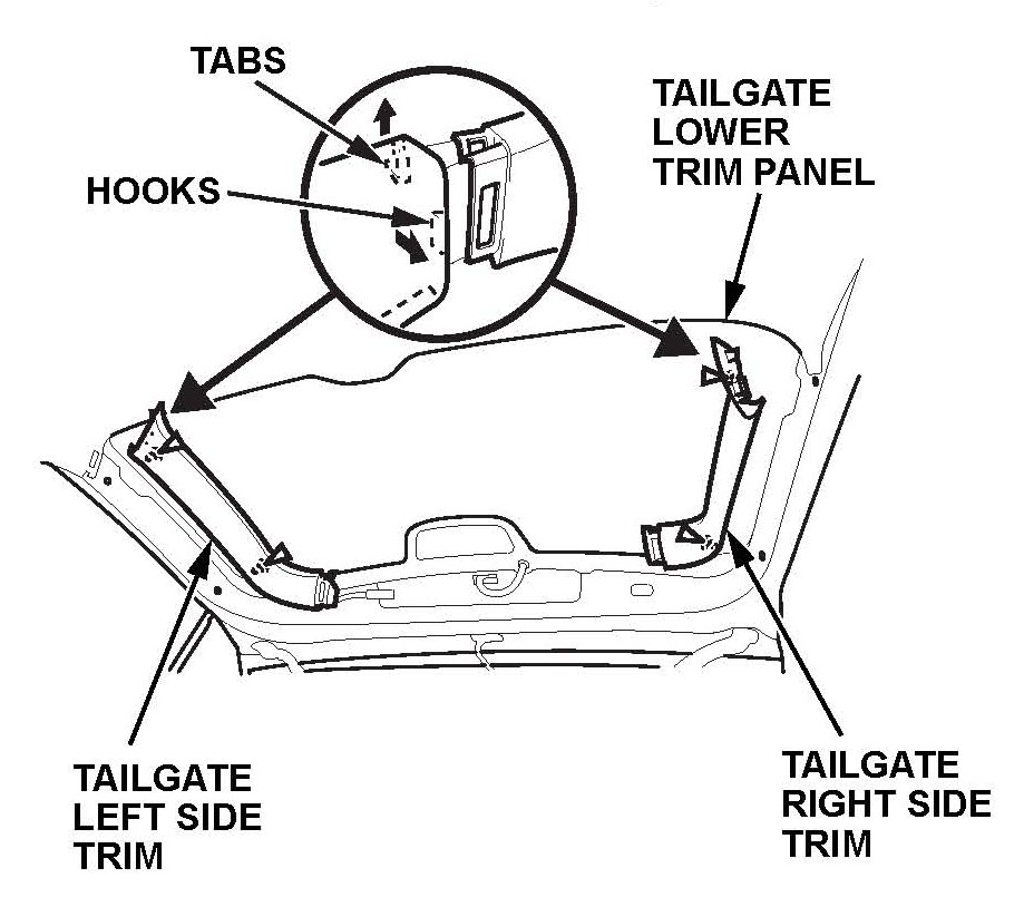 ^ Release the hooks and the tabs from the tailgate left side trim and the tailgate right side trim.