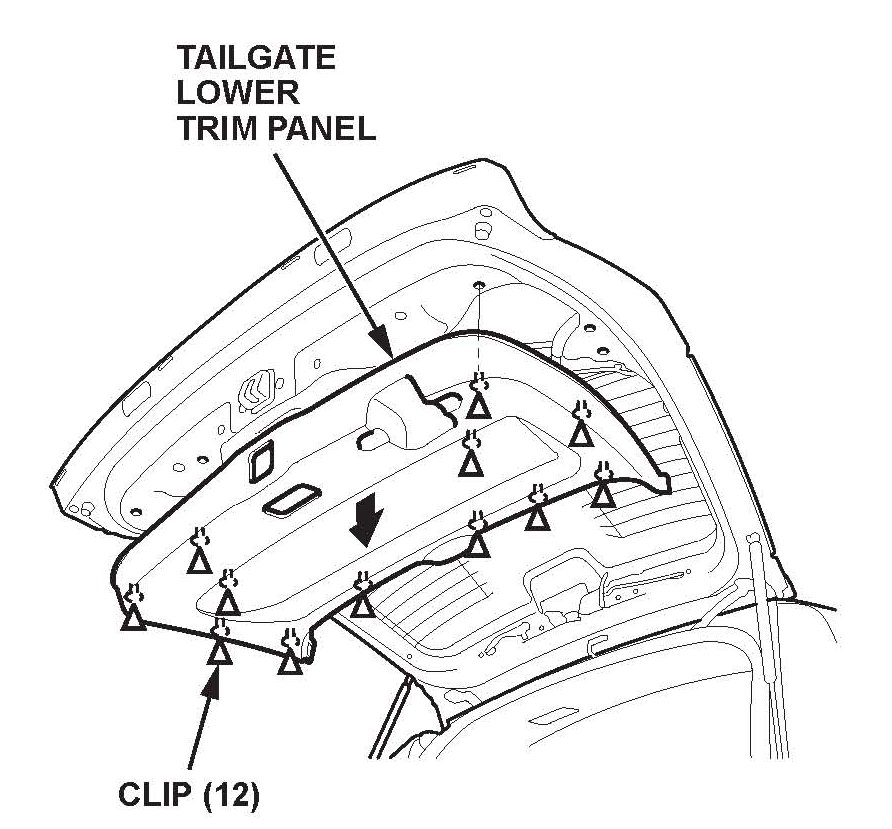 4. Pull off the tailgate lower trim panel by hand to detach the clips, then remove the trim panel.