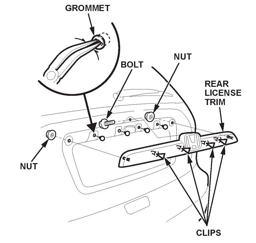 8. Remove the grommets from the tailgate, then install them onto the clips on the rear license trim.