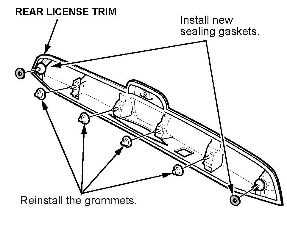 9. Install the new sealing gaskets on the studs of the rear license trim.