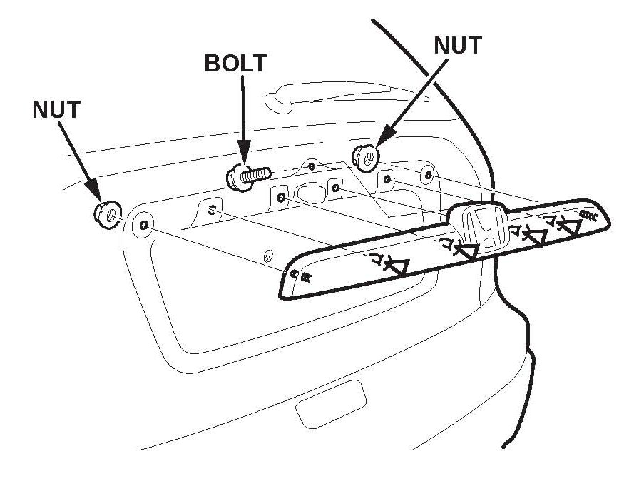 5. From inside the tailgate, remove the bolt and the nuts securing the rear license trim.