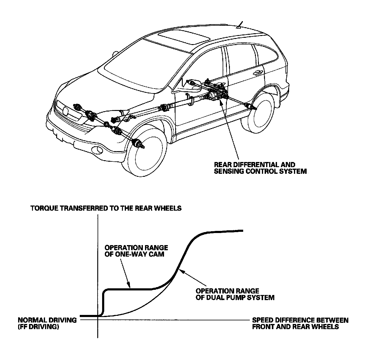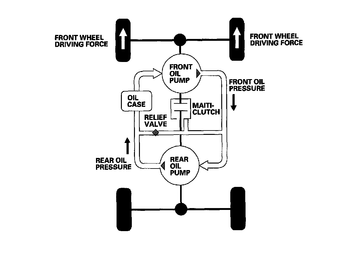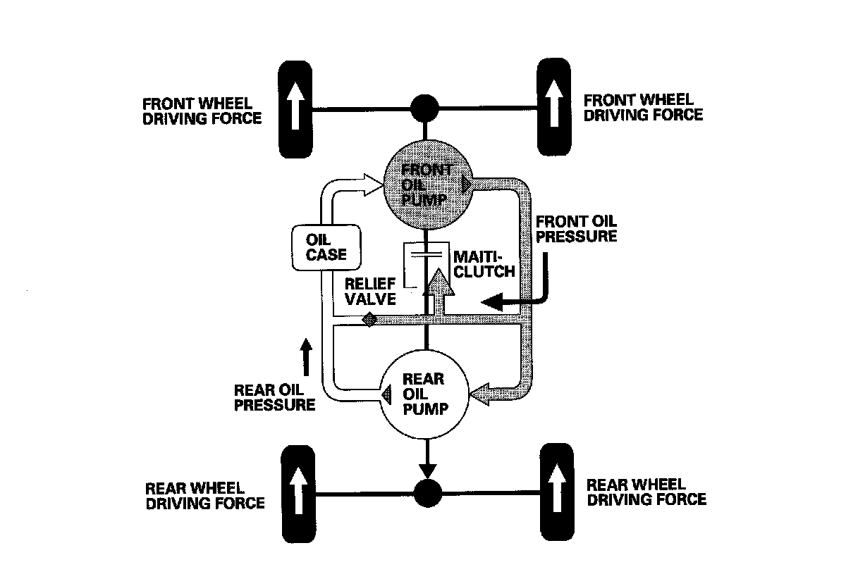 - 1 When the front wheel speed exceeds that of the rear wheel speed during forward starting and acceleration, and driving on slippery roads, the front oil pump speed exceeds that of the rear oil pump, producing hydraulic pressure.