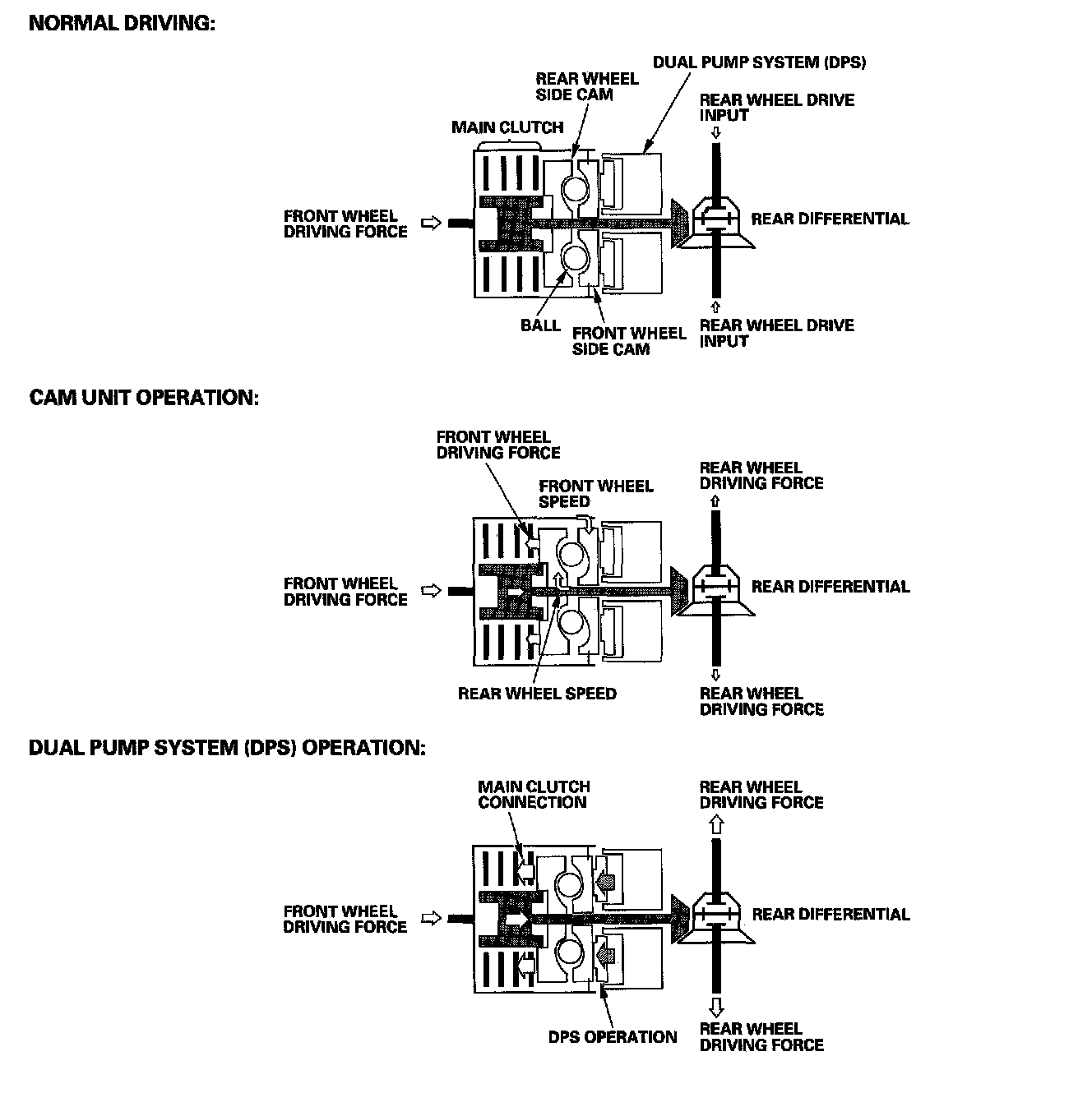 When a difference of the front and rear wheel speeds develops, a difference in the rotational speed of the two cams also develops, and the front cam rotational speed exceeds that of the rear cam. When this happens, the balls move along the cam groove, pushes and widens the cams, and applies pressure to the main clutch. When the speed difference becomes greater, the dual pump system (DPS) operates. Since the cam unit is a one-way type, it only operates when driving forward.