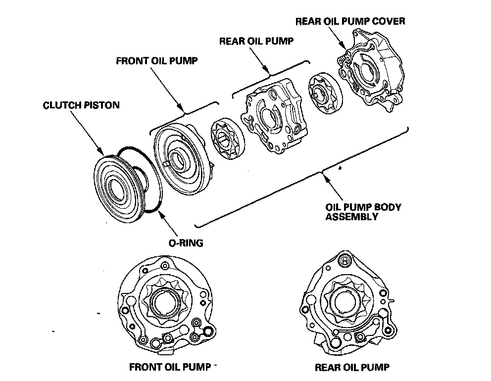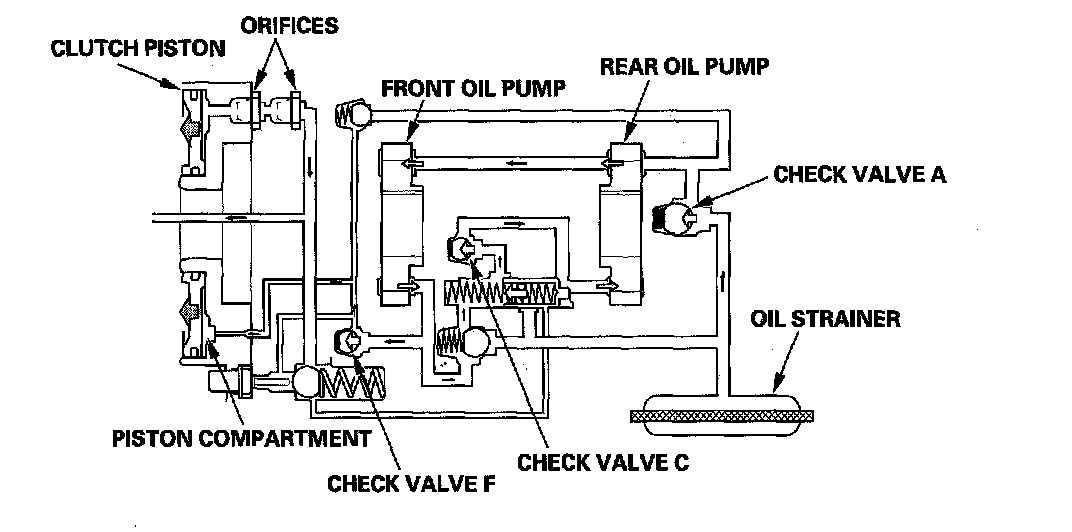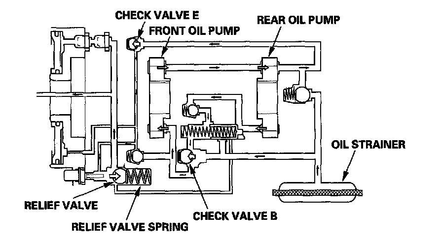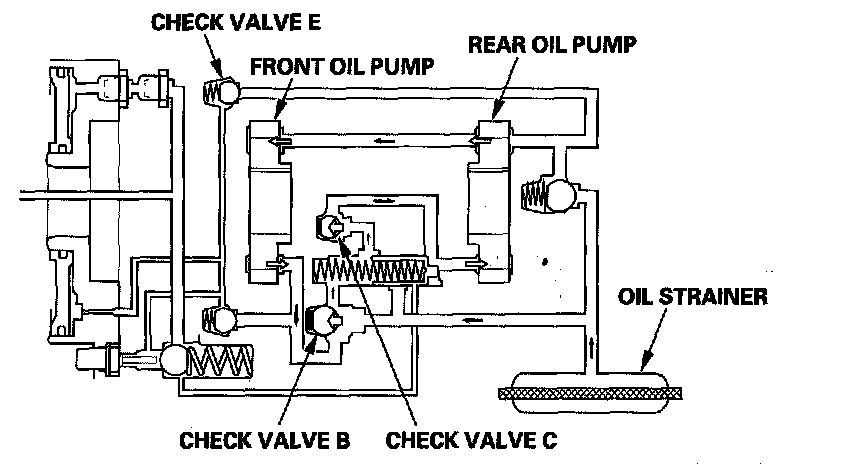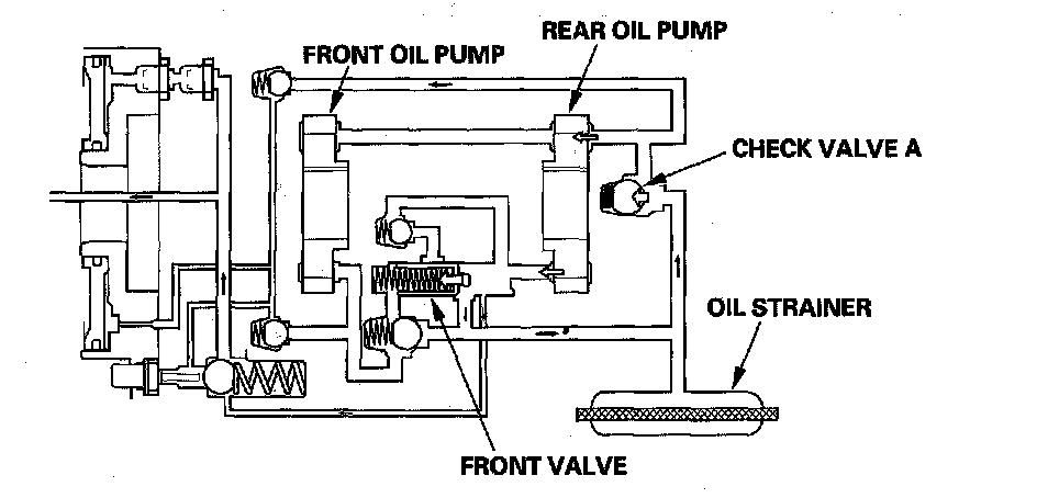 - 2 During reverse driving, the oil pumps rotate in reverse. However, the oil drawn in by the front pump from the oil strainer passes the check valve A and rear oil pump, and then is drawn in and discharged by the front oil pump.
