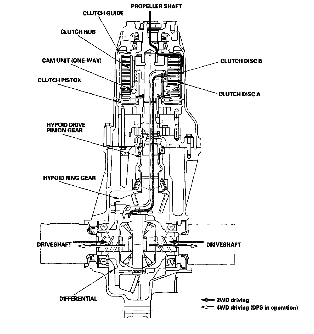 The front wheel driving force from the propeller shaft is transmitted to the clutch guide and the clutch plate. When DPS is not operating, the rear wheels follow the front wheels. From the rear driveshafts, the rear wheel operation is input to the differential, link gear, drive pinion gear, clutch hub, clutch disc, and power is not transmitted to the rear wheels.