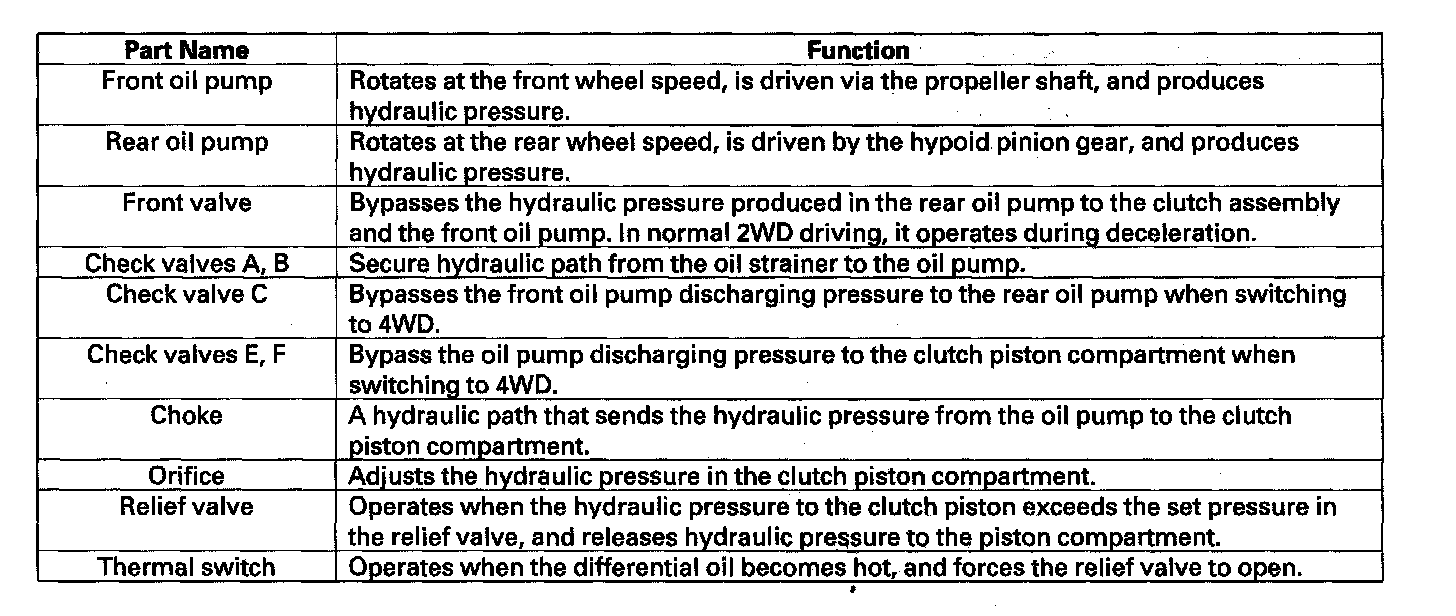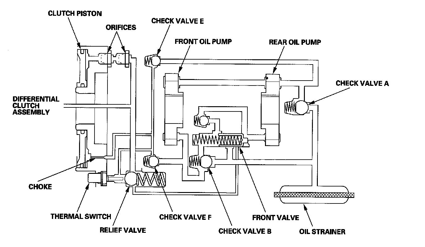 Built inside the oil pump assembly, the hydraulic circuit provides clutch assembly lubrication together with 4WD control. The hydraulic circuit consists of the front and rear oil pumps, the front valve and five check valves for hydraulic route switching, the choke section which is the hydraulic path to the clutch piston compartment, and the two orifices that controls the hydraulic pressure in the piston compartment.