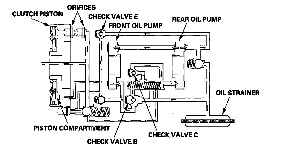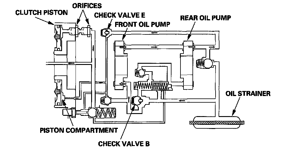 - 3 Excess oil from the oil discharged from the rear oil pump exceeds the drawing capacity in the front oil pump, passes through the check valve E, travels to the piston compartment, and is pressure-regulated at the two orifices.