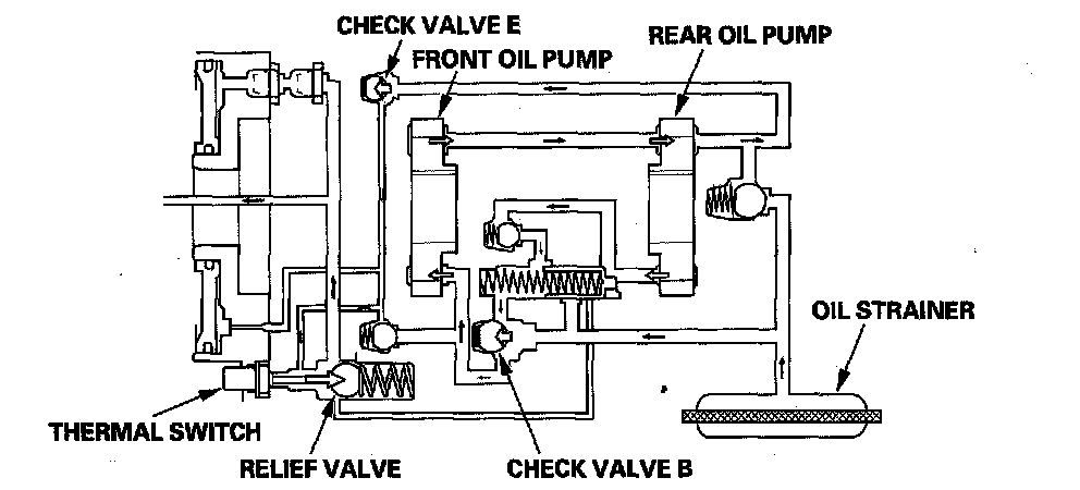 - 2 The oil drawn in by the front oil pump from the oil strainer, passes through check valve B, and is drawn in or discharged.