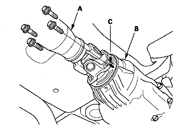 3. Mark the propeller shaft (A) and the companion flange of the rear differential assembly (B) so they can be reinstalled in their original positions (C).