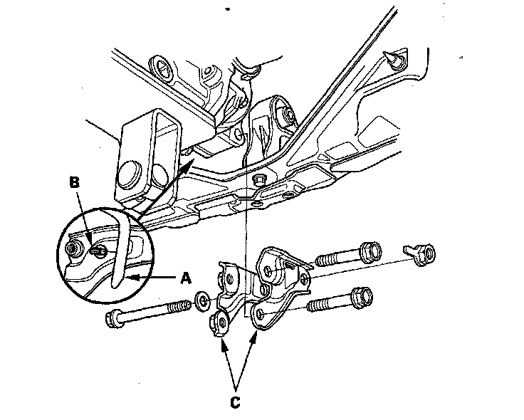 6. Place a transmission jack under the rear differential assembly, then remove the right and left rear differential mount bracket (C).