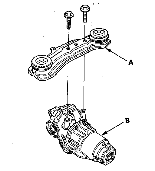 11. Remove the rear differential mount assembly (A) from the rear differential assembly (B).