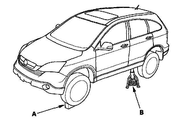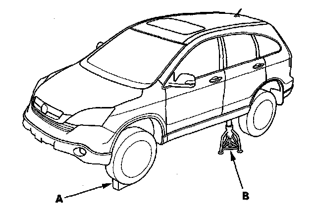1. Block the front wheels (A), raise the left rear wheel, and support it with a safety stand (B) as shown.