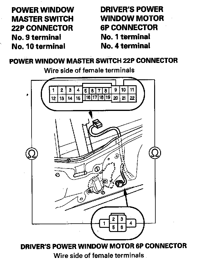 5. Check for continuity between the power window master switch 22P connector No. 9 and No. 10 terminals and the driver's power window motor 6P connector No. 1 and No. 4 terminals, respectively.
