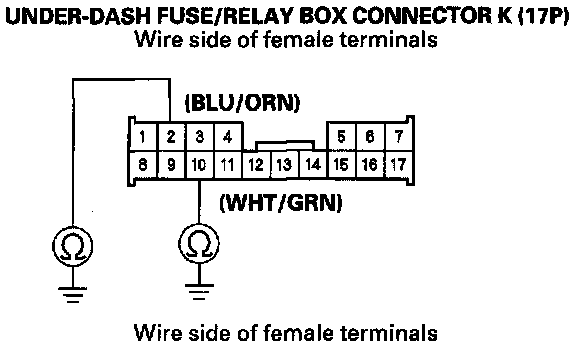 8. Check for continuity between body ground and the under-dash fuse/relay box connector K (17P) No. 2 and No. 10 terminals.