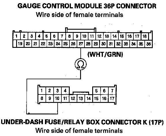 9. Check for continuity between the gauge control module 36P connector No. 27 terminal and the under-dash fuse/relay box connector K (17P) No. 10 terminal.
