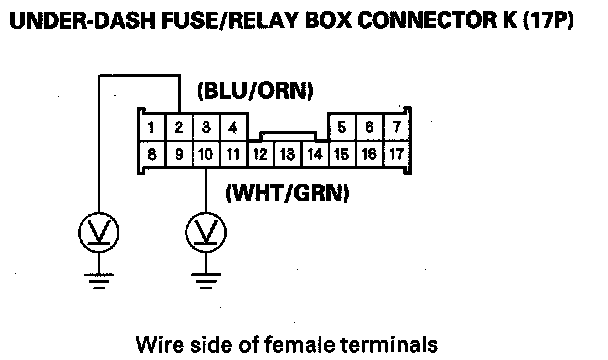 11. Measure voltage between body ground and the under-dash fuse/relay box connector K (17P) No. 2 and No. 10 terminals.