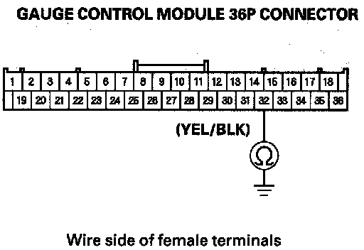 13. Check for continuity between gauge control module 36P connector terminal No. 32 and body ground.