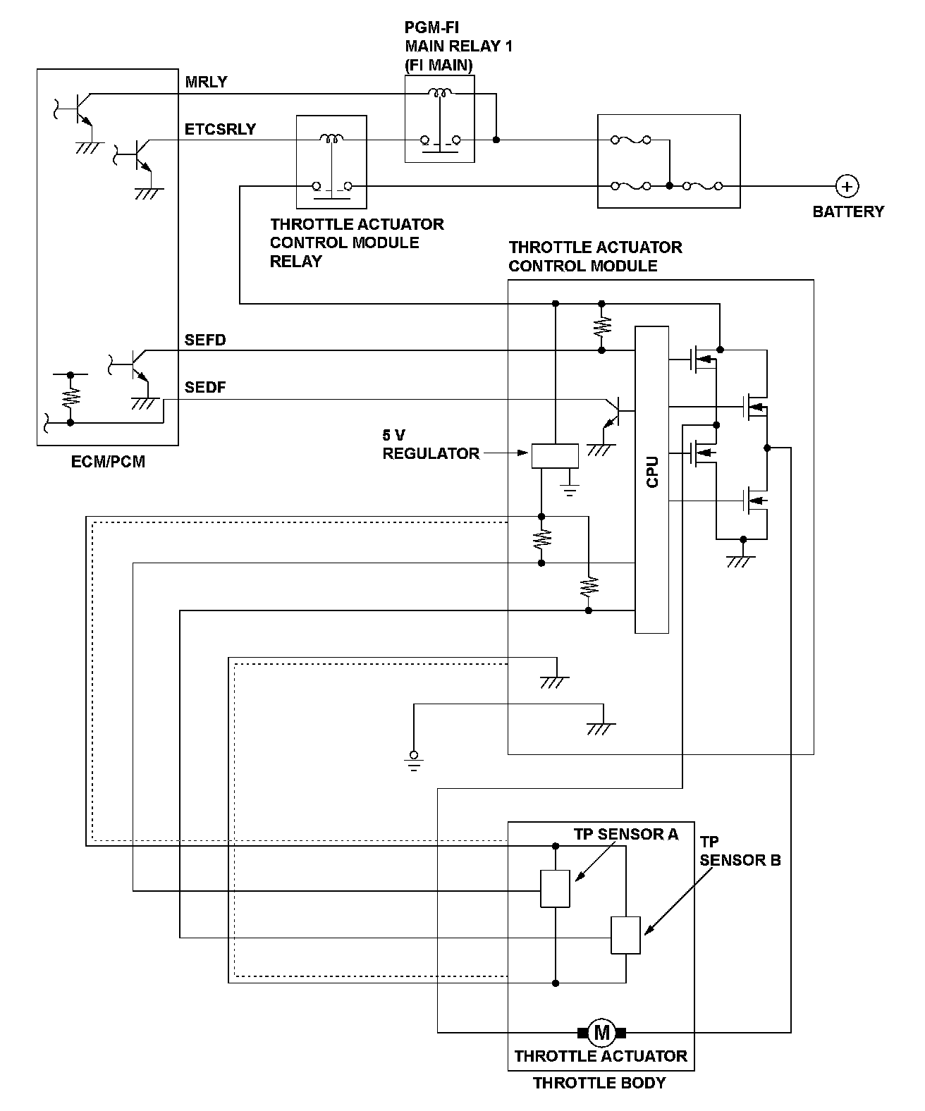 The throttle valve position signal from TP sensor B is transmitted to the throttle actuator control module for target position feedback control, then to the engine control module (ECM)/powertrain control module (PCM) as an actual throttle valve position signal.