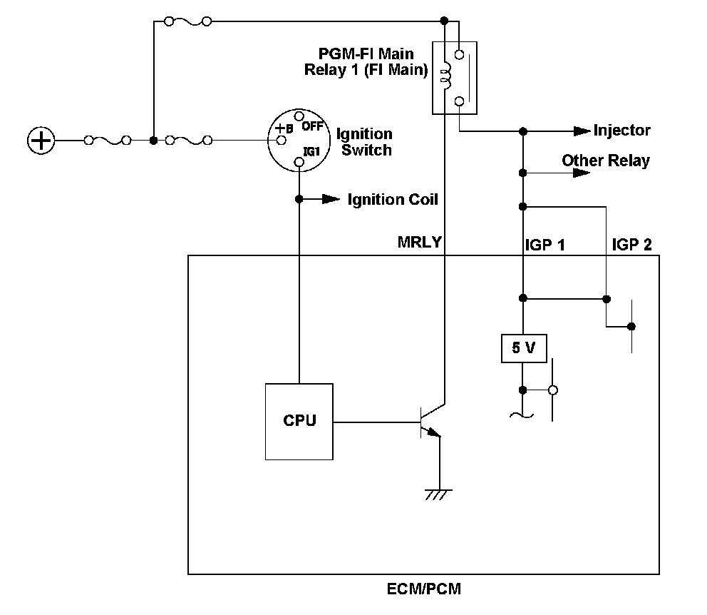During a normal ECM/PCM shut down, the shut down process is executed by the CPU, PGM-FI main relay 1 (FI MAIN) is turned off, and the voltage to the ECM/PCM is turned off to shut down the ECM/PCM. When the voltage to the ECM/PCM is turned off and the ECM/PCM shuts down without the normal shut down procedure, a malfunction in the PGM-FI main relay 1 (FI MAIN) control circuit is detected and a DTC is stored.