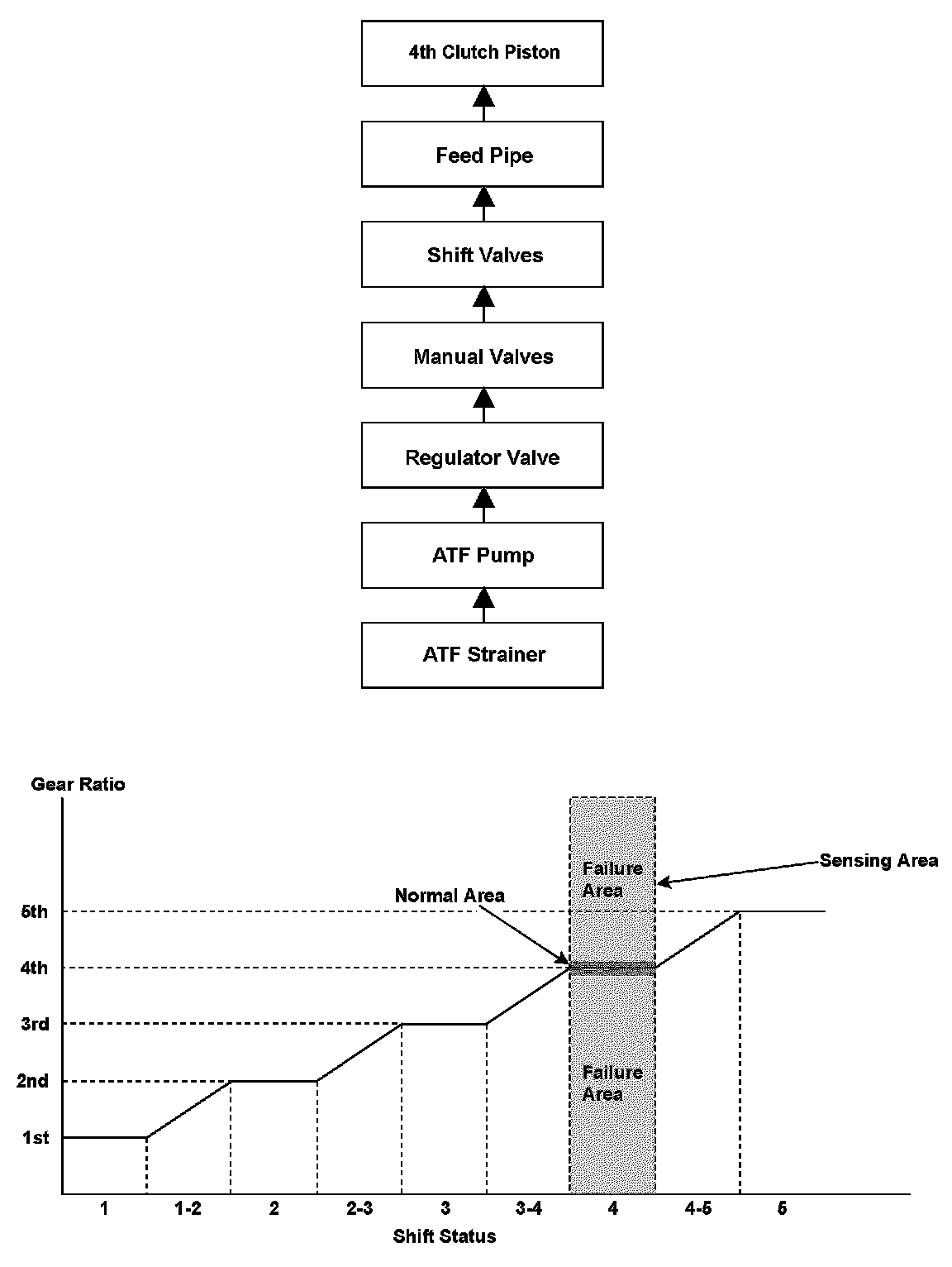 To engage 4th gear, line pressure is supplied to the 4th clutch piston, engaging the 4th clutch, and the input shaft (mainshaft) and the input shaft (mainshaft) 4th gear are connected and revolve together. Hydraulic pressure is supplied to the 4th clutch through the ATF strainer the ATF pump the regulator valve the manual valve the shift valves the feed pipe 4th clutch piston. (A shift valve failure in the supply route above is detected by the malfunction detection of each shift solenoid valve.) The powertrain control module (PCM) computes the ratio of the input shaft (mainshaft) speed to the output shaft (countershaft) speed. When the ratio is not the 4th gear ratio, it is detected as a malfunction of the hydraulic circuit or the 4th clutch, and a DTC is stored.