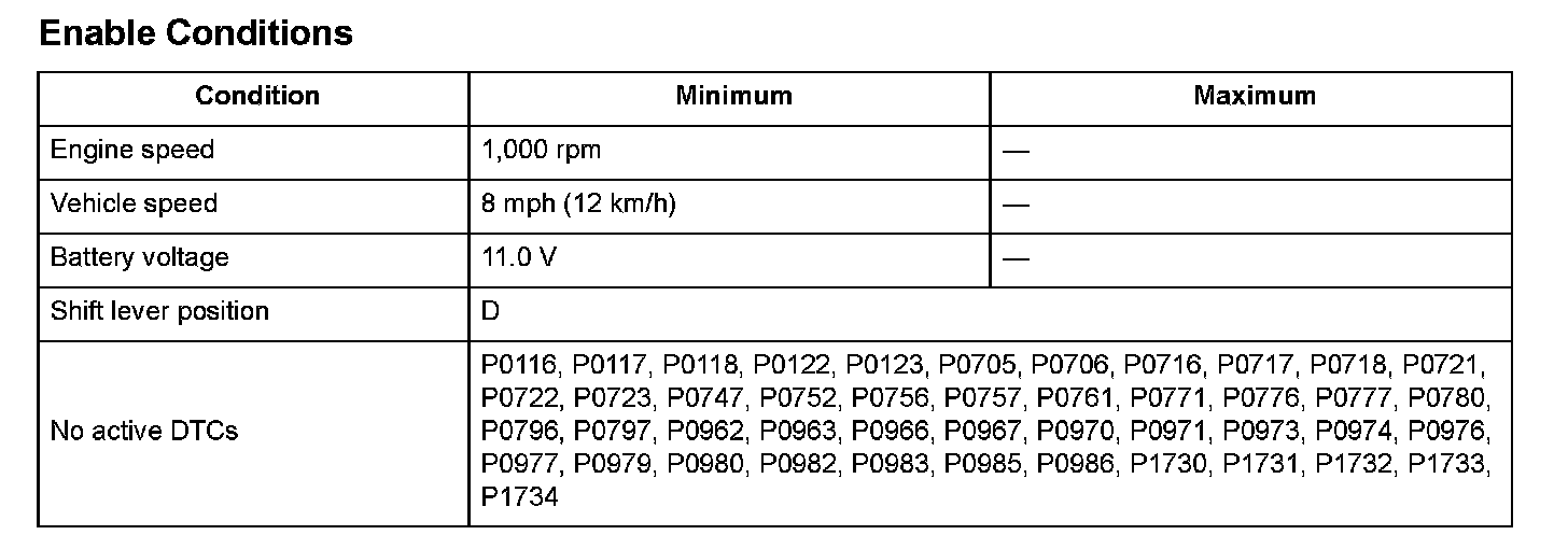 Start the engine, shift to D position, and drive the vehicle at a speed of 8 mph (12 km/h) or more for at least 12 seconds in 4th gear.